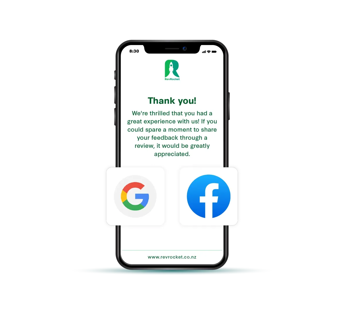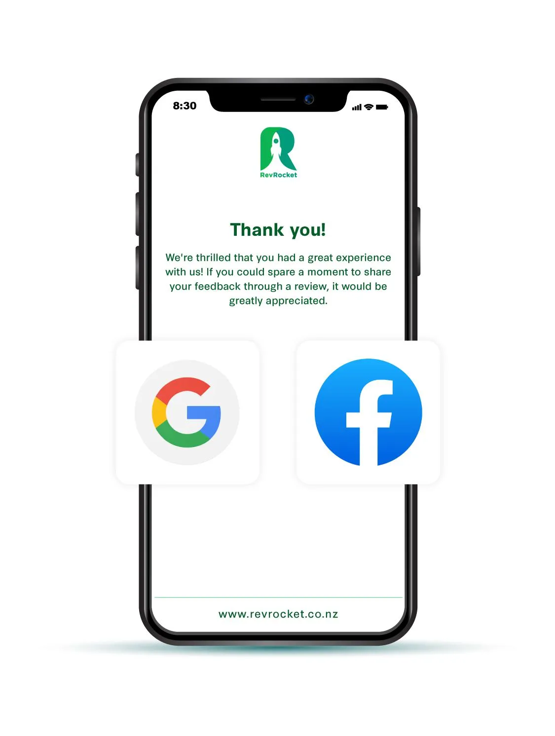 Encourage your satisfied customers to leave a top-rating review for your business, which will automatically be shared on major platforms like Google Reviews and Facebook.